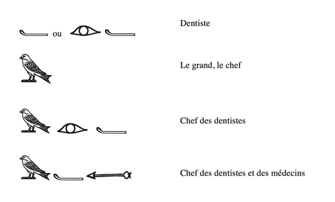 On repère à cette époque les dentistes par l’association de plusieurs signes : une défense d’éléphant seule, ou l’association des signes œil et défense : le signe de l’œil voulant dire, dans le contexte médical « traiter » ou « s’occuper de ».